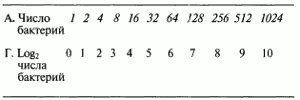 Когда число клеток увеличивается, как видно из заполненной вами табл. 2.4, говорят о логарифмическом, экспоненциальном или геометрическом росте. В этом случае мы получим экспоненциальный ряд чисел. Это гораздо легче понять, если посмотреть на строку В в табл. 2.4, где число бактерий выражено в виде числа 2, возведенного в соответствующую степень. Показатель степени можно назвать логарифмом или экспонентной числа 2. Логарифмы, или экспоненты, образуют линейный ряд 0, 1, 2, 3 и т.д., соответствующий числу генераций.