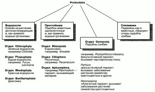 В разд. 2.2. уже отмечалось, что среди царств в систематике Маргелиса и Шварца (рис. 2.4) Protoctista, возможно, является самой спорной группой, поскольку естественные связи между входящими в нее организмами очень слабы. По сути в эту группу собраны все эукариотические организмы, не укладывающиеся по строгим критериям ни в одно из эукариотических царств. Многие из протоктистов – одноклеточные организмы.
