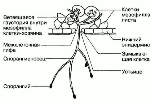 Мицелий, состоящий из разветвленных нечленистых гиф, распространяется по межклеточным пространствам внутри листьев, образуя ветвящиеся гаустории, которые, проникая в клетки мезофилла, высасывают из них питательные вещества (рис. 2.29). Гаустории – типичные для облигатных паразитов образования специализированы для проникновения и всасывания. Каждая из гаусторий представляет собой видоизмененный вырост гифы, обладающий большой поверхностью. Такие выросты (гаустории) проникают в клетки, не разрушая плазматические мембраны и не убивая клетки. В теплой и влажной среде мицелий образует спорангиеносцы, выступающие из нижней стороны листа через устьица или раны. Спорангиеносцы ветвятся, давая начало спорангиям (рис. 2.29). В теплой среде спорангии могут вести себя как споры, т.е. переноситься ветром или с брызгами от капель дождя на другие растения, распространяя таким образом инфекцию. Затем из спорангия вырастает гифа, которая проникает через устьица, чечевички или повреждения внутрь ткани растения. В холодных условиях содержимое спорангия делится с образованием подвижных зооспор (этот признак характерен для примитивных организмов), которые высвобождаются из спорангия и плавают в тонком слое жидкости, адсорбированной на поверхности листа. Зооспоры могут инцистироваться и в таком состоянии дожидаться, пока условия не станут более благоприятными для роста гиф; тогда-то и начинается заражение новых растений.