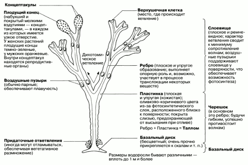 Рис. 2.31. Внешнее строение Fucus vesiculosus; отмечены характерные признаки, в частности адаптации к окружающей среде.