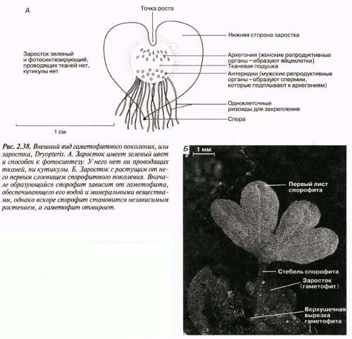 Споры прорастают, давая начало гамето­фитному поколению. Гаметофит представляет собой тонкую сердцевидную пластинку клеток диаметром около 1 см (рис. 2.38). Эта пластин­ка имеет зеленый цвет, способна к фотосинте­зу и прикрепляется к почве одноклеточными ризоидами. Поскольку у такого нежного заро­стка нет кутикулы, он быстро высыхает и, сле­довательно, может жить только во влажной среде.