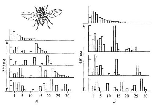 Рис. 8.5. Содержание различных мутаций в географически удаленных (А) и близких (Б) популяциях Drosophila funebris (по Н.В. Тимофееву-Ресовскому и др., 1972)