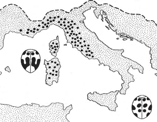 Особый интерес представляют случаи распространения мутаций в пределах ареала вида, позволяющие судить о том, как мутация «выходит» на историческую, эволюционную арену. На рис. 8.6 приведен один из примеров такого рода: распространение одной полудоминантной мутации слияния пятен на надкрыльях растительноядной божьей коровки, обитающей в Южной Франции, Северной Италии, на Корсике и в Сардинии.