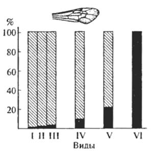 По изучению генетического состава природных популяций проведено много работ на разных группах растений (львиный зев, фиалка, пикульник и др.), беспозвоночных (дрозофилы, непарный шелкопряд, божьи коровки и др.) и позвоночных (мышевидные хомячки, домовые мыши, крысы, полевки и др.). Во всех случаях популяции отличались друг от друга лишь встречаемостью генных, хромосомных или геномных мутаций. Приведем лишь два характерных примера. На рис. 8.7 приведены данные по встречаемости диагностического признака (второй двойной поперечной кубитальной жилки крыла) у самцов шести видов земляных ос. Эксперименты показали, что этот признак определяется моногибридно наследующейся рецессивной мутацией. У трех видов признак встречается в качестве редкого варианта, у двух других видов — как обычный вариант, наконец, у одного вида — как видовой, встречаясь у большинства особей.