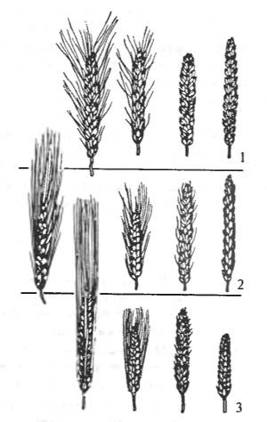 Рис. 8.11. Гомологичные ряды изменчивости по форме колосьев у мягкой (1) и твердой (2) пшеницы и ячменя (3). Во всех случаях есть остистые и безостые формы (по Н.И. Вавилову, 1935)