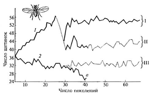 Рис. 9.1. Пример возникновения элементарного эволюционного явления при искусственном отборе по числу абдоминальных щетинок в эксперименте с Drosophila melanogaster (по П. Эрлиху и Р. Холму, 1966). Пунктир — линия без отбора; а — вымерла из-за стерильности потомства. Отбор на увеличение (1) и уменьшение (2) числа щетинок в течение 30 поколений привел к возникновению линий с разными признаками (разным числом щетинок, I—III)
