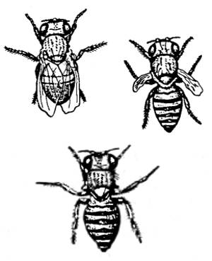 Рис. 9.2. Внешний вид трех мутантных форм дрозофил с редуцированными крыльями. См. текст (из А.С. Северцова, 1980)