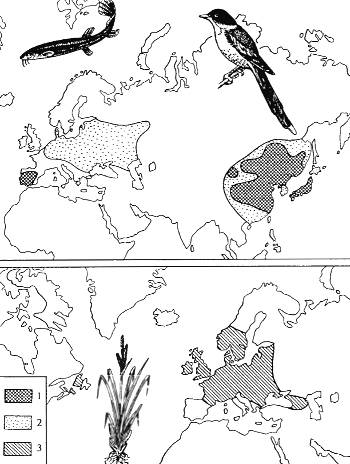 Рис. 9.4. Примеры разорванных ареалов: ареалы голубой сороки (Cyanopica суапа) (1) и вьюна (Misgurnus fossilis) (2) (из Н.В. Тимофеева-Ресовского и др., 1977)