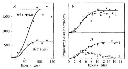 Рис. 10.1. Примеры борьбы за существование (БЗС) в экспериментах. А. Внутривидовая БЗС. Численность мучного хрущака (Tribolium confusum) в зависимости от исходного количества муки (по Р. Чэпман, 1931). Б. Межвидовая БЗС. Численность особей двух видов парамеций (Paramecia) при размножении отдельно (I) и в смешанной культуре (II). В смешанной культуре P.aurelia (1)и P. caudatum (2) второй вид погибает (Г.Ф. Гаузе, 1934)