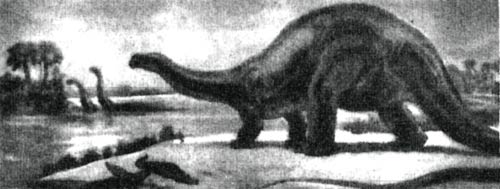 Фото 45. Apatosaurus, четвероногий динозавр, подобный амфибиям, длиной более 20 м, на берегу юрского водоема. Два других таких же динозавра пасутся в воде. По сравнению с ними крокодил на переднем плане выглядит совсем маленьким. Растительность состоит из цикадовых и хвощей. Реконструкция.
