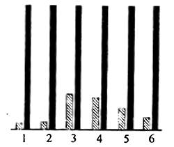 Рис. 10.10. Увеличение выработки антибиотиков в результате искусственного отбора микроорганизмов (по СМ. Гершензону, 1991): 1 — пенициллина в 24 раза; 2 — стрептомицина в 17 раз; 3 — хлортетрациклина в 4 раза; 4 — эритромицина в 4 раза; 5 — альбомицина в 6 раз; 6 — олеандомицина в 10 раз. Микроорганизмы, вырабатывающие такие количества антибиотиков, не могут самостоятельно существовать в природе и их популяции специально поддерживаются в искусственных условиях. Заштрихованные столбики — выработка антибиотиков до отбора