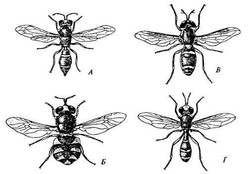Рис. 11.6. Мимикрия мух, подражающих осам (бейтсовская мимикрия): А — хорошо защищенная оса-одинер (Odynerus parietum); Б — муха-львинка (Stratiomia chamaeleon), подражающая осам окраской брюшка и формой усов; В — муха-сирфида (Chrysotoxum bicinetum), подражающая осам окраской и частично формой тела; Г— муха-большеголовка (Conops flavipes) — совершенная копия внешнего вида некоторых ос (по А.С. Серебровскому, 1973)