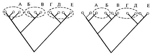 Рис. 15.8. Варианты (А—Е) объединения одних и тех же видов в роды в зависимости от вымирания отдельных видов. Пунктиром показаны вымершие формы (ориг.)