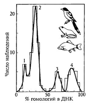 На рис. 15.9 изображена дискретность степеней родства у позвоночных животных, определенная методом молекулярной гибридизации ДНК. Наиболее низкий процент гомологий характеризует ДНК представителей разных классов, таких, как птицы, пресмыкающиеся, рыбы и амфибии (5—15% гомологий). От 15 до 45% гомологий в ДНК обнаруживается у представителей разных отрядов внутри одного класса, 50—75% у представителей разных семейств внутри одного отряда. Если же сравниваемые формы относятся к одному семейству, в их ДНК от 75 до 100% гомологий. Сходные картины распределения обнаружены в ДНК бактерий и высших растений, однако цифры там совсем другие (род бактерий по гомологиям ДНК соответствует отряду, а то и классу позвоночных). Моделирование процесса потери гомологий в ДНК на ЭВМ показало, что подобные многовершинные распределения могут возникать лишь в том случае, если эволюция идет «по Дарвину» — путем отбора каких-то вариантов с вымиранием промежуточных форм (В.В. Меншуткин). Сравнение особенностей ДНК оказывается перспективным для уточнения филогенетических иерархических систем, построенных классическими методами.