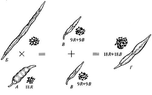 Рис. 15.10. Схема синтеза формы видового ранга — редько-капусты; А — стручок редьки Raphanus sativus и ее хромосомный набор (18R); Б — стручок капусты Brassica oleracea и ее хромосомный набор (18B); В — первичный, полностью стерильный из-за нарушения мейоза гибрид с хромосомным набором 9R + 9B; Г— аллотетраплоид с хромосомным набором 18R + 18B вполне плодовитый, так как в мейозе 18 хромосом R конъюгируют друг с другом и образуют 9 бивалентов, как и 18 хромосом В (по Г.Д. Карпеченко, 1935)