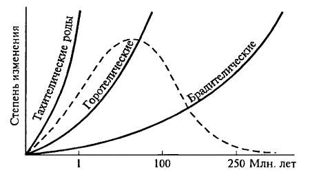 Сравнение большого материала по темпам возникновения и длительности развития новых родов позволило выделить три группы родов (рис. 15.12). К первой группе принадлежат брадителические роды, филогенетические реликты (см. ниже); время их развития превышает 250 млн лет. Ко второй группе принадлежат горотелические роды, время развития которых составляет от нескольких до нескольких десятков миллионов лет, и, наконец, к третьей группе — тахителических родов — принадлежат роды, время развития которых невелико, много меньше I млн лет (Дж. Г. Симпсон).