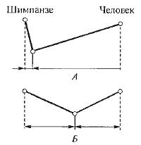 Рис. 16.3. Скорость эволюции разных признаков в предковых линиях шимпанзе (Pan troglodyres) и человека (Homo sapiens): А — масштаб изменений внешнего облика; ? — масштаб изменений белков. Скорость изменения внешнего вида много выше у человека, скорость изменения белков одинакова (из В. Гранта, 1980)