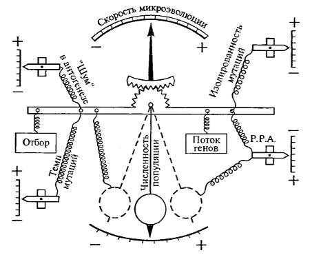 Рис. 16.5. Схема влияния на скорость эволюции различных микроэволюционных факторов. На этой механической модели (предложенной Д. Шпирлихом, 1973) видно разнонаправленное взаимодействие эволюционных факторов. Р.П.А — радиус репродуктивной активности особи (из А.В. Яблокова, 1987)