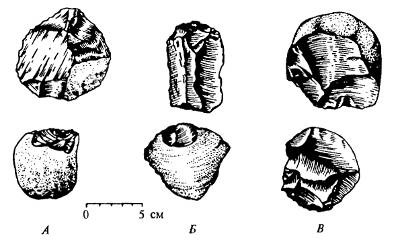 Рис. 18.2. Орудия архантропов, найденные: А — к востоку от оз. Туркана, Кения, олдовайская культура, около 2 млн лет назад: Б — в Закарпатье, у пос. Королева, около 400 тыс. лет назад; В — в Таджикистане, около 200 тыс. лет назад (по данным разных авторов)