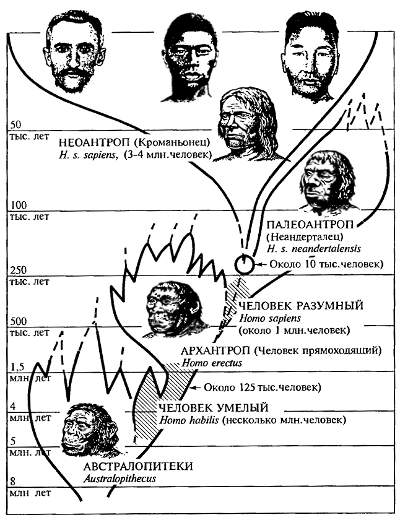 Несмотря на все большее сходство с современным человеком, древнейшие люди по ряду существенных морфологических признаков отличались от современного человека (см. рис. 18.3). Их эволюция направлялась в основном еще биологическими факторами, включавшими жесткий естественный отбор, связанный с внутривидовой борьбой за существование. После периода максимального расцвета 600—400 тыс. лет назад эти формы исчезли, дав начало новым группам — палеоантропам (неандертальцам) и неоантропам.