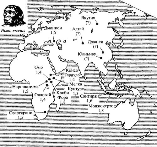 Рис. 18.4. Места и время обитания (млн лет) архантропа по Ойкумене (по данным разных авторов)