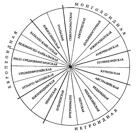 Рис. 18.8. Схема взаимоотношения современных рас человека (по Я.Я. Рогинскому и М.Г. Левину, 1978)