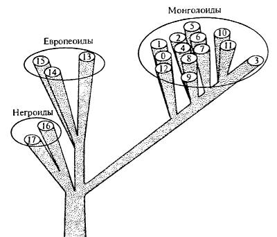 Рис. 18.9. Родственные взаимоотношения (по данным молекулярной филогении) некоторых популяций человека: 1 — ненцы; 2 — ханты; 3 — теленгеты; 4 — эвенки; 5 — якуты; 6 — эскимосы; 7 — нивхи; 8 — корейцы; 9 — вьетнамцы; 10 — тувинцы; 11 — буряты; 12 — киргизы; 13 — русские; 14 — грузины; 15 — норвежцы; 16 — малагасийцы; 17 — эфиопы (из В.А. Шереметьева и др., 1983)