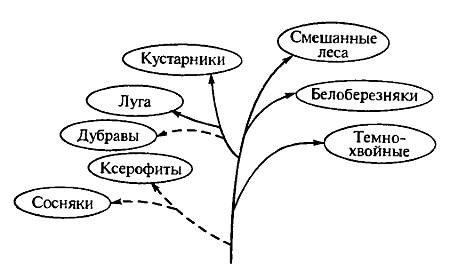 Другой подход к анализу эволюции экосистем состоит в восстановлении последовательности формирования крупных экосистем, установлении путей формирования типов ценозов в данном регионе. Пример подобного подхода показан на рис. 19.3, где изображено филогенетическое древо (филоценогенез) крупных типов фитоценозов (классов формаций, по Б.Б. Сочаве). Все эти классы формаций произошли из древней маньчжурской праформации (признаки которой сохранились в большей степени в типе фитоценоза смешанных лесов). Наиболее древними формациями из существующих ныне являются сосняки и травянистые ксерофиты. Ряд формаций возник в результате деятельности человека (дубняки, кустарники, луга).