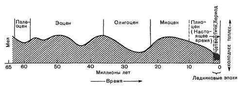 Таким образом, существует три вида данных, различных, но свидетельствующих об одном и том же: понижении температур в кайнозое, наиболее сильно проявившемся в высоких широтах южного полушария. По этим и некоторым другим данным была построена кривая (рис. 62), которая показывает повышения и понижения температуры в течение кайнозойской эры. За исключением ее крайней правой части, кривая построена исключительно на основе перечисленной выше информации. Кривая показывает также, что изменения температур были медленными и постепенными, но отнюдь не постоянными.
