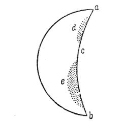«19 июня 1780 г. На диске Венеры имеется темноватое голубоватое пятно adc и другое, довольно яркое ceb; они сходятся под некоторым углом, вершина которого отстоит от конца серпа а примерно на 1/3 диаметра Венеры. 21, 23, 24, 25, 26, 28, 29, 30 июня и 3 июля. Продолжались наблюдения этих и других слабых пятен… Для наблюдений использовался 20-футовый рефлектор системы Ньютона, к которому имелось по меньшей мере пять главных зеркал, причем некоторые из них обладали самым высоким совершенством формы и полировки. Увеличение в основном было 300 и 450 раз. Однако результаты не позволяют мне определить период вращения Венеры. Различные эффекты в оптике телескопа, вроде тех, которые могут происходить при преломлении света, часто приводили к появлению ложных пятен. Я не склонен придавать какого-либо значения движению пятен, которые были либо крайне слабы и изменчивы, либо их положение вообще нельзя было точно определить. Однако на основании этих наблюдений нельзя сомневаться в том, что Венера вращается вокруг оси; также очевидно, что планета имеет атмосферу, так как замеченные мною изменения явно не могут происходить на твердой поверхности Венеры». Шрётер был человеком совсем другого склада. Ему недоставало осторожности и спокойствия в суждениях, характерных для Гершеля, но он был таким же безграничным энтузиастом и именно он является основателем лунной и планетной астрономии. Например, его работа о Луне принадлежит к числу самых ценных. В последнее время стало довольно модным порицать Шрётера; считают даже, что его телескопы были слишком плохого качества, чтобы от них могло быть много пользы. В частности, Вокулер в своей в целом превосходной книге по истории астрономии утверждает, что «к несчастью, едва ли какие-нибудь из его выводов пережили испытание временем… поэтому астрономия получила очень мало пользы от его деятельности». Однако детальное изучение дошедших до нас книг и записей показывает, что такая точка зрения, по-видимому, не оправдана. Шрётер был плохим рисовальщиком, но серьезные ошибки он делал редко; самый большой из его телескопов — 19-дюймовый рефлектор, изготовленный Шредером из Киля,— возможно, был посредственного качества, но два других его инструмента, изготовленные Гершелем, без сомнения, были хорошими.