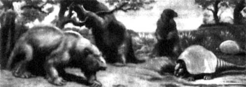 Фото 50. Необычайные южноамериканские млекопитающие, обитавшие на территории Аргентины в плейстоцене. Слева - наземные ленивцы, справа - глиптодонты (гигантские броненосцы) с панцирем, как у черепах. Реконструкция.