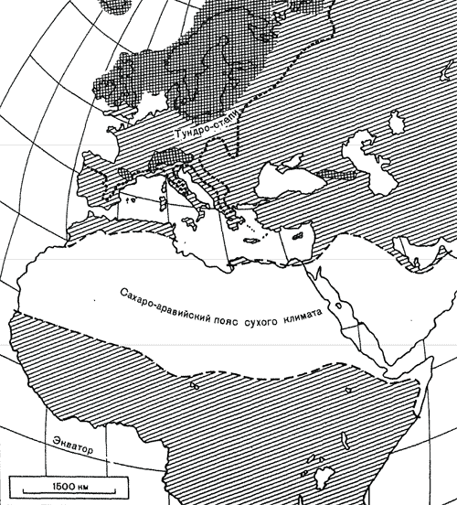 Рис. 70. Карта Европы, Западной Азии и Африки в последнюю ледниковую эпоху; показаны положение европейского ледникового покрова и ледники в Исландии, Пиренеях, Альпах и на Кавказе. Южнее находится пояс сухого климата.