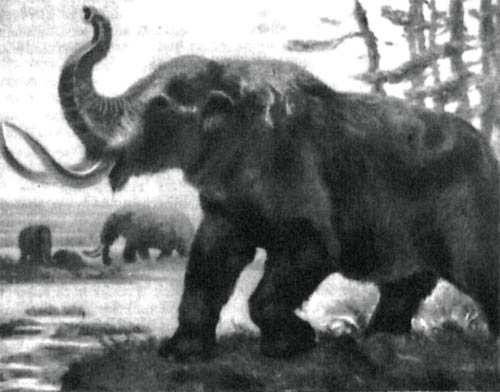 Самым замечательным обитателем зоны еловых лесов, в которую переходила тундра, был американский мастодонт (фото 56), коренные зубы которого приспособились к пережевыванию веток деревьев. В тундре он чувствовал себя, вероятно, менее уютно, но он мог прокормиться всюду, где росли деревья. Поэтому мастодонт был распространен почти во всех частях США, покрытых в то время лесом, вплоть до Флориды и даже центральной Мексики на юге. Еще две особенности строения мастодонта, помимо устройства зубов, давали ему, возможность, жить в лесу: он был меньше мамонтов и его клыки (были гораздо короче по сравнению со всем телом. Поэтому он мог легче передвигаться в густых зарослях деревьев.