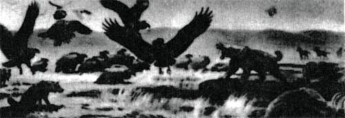 Фото 59. Реконструкция сцены, происходившей в ледниковую эпоху в районе нефтяных выходов ранчо Ла-Бреа. Два саблезубых тигра кормятся падалью, а третий отгоняет голодных стервятников. Слева - волки, ожидающие своей очереди. На заднем плане справа - лошади.