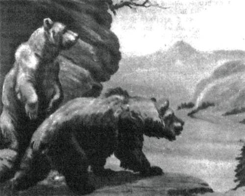 Фото 61. Европейский пещерный медведь (Ursus spelaeus), огромное животное ледниковой эпохи, достигавшее размеров ныне живущего на Аляске бурого медведя. В пещерах Европы находятся кости сотен тысяч этих животных. В тех пещерах, где медведи зимовали, скальные стены у входа отполированы их косматыми шкурами.