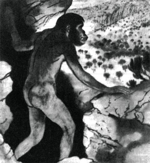 Фото 65. Реконструкция австралопитека около входа в пещеру на склоне холма в Южной Африке. Сравните его более вертикальное положение с положением тела рамапитека на фото 63. С холма у пещерного входа открывается вид на засушливый ландшафт типа саванны.