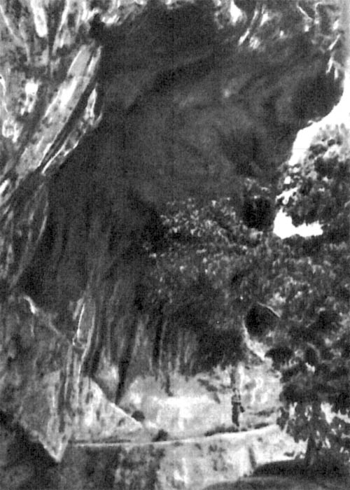 Фото 70. Скальный грот под выступом юрского известняка на реке Эн в юго-восточной Франции. В нижней части снимка видны частично вскрытые отложения, выполняющие грот. Они представлены культурными слоями, перемежающимися с включениями песка, который был принесен рекой в эпоху последнего оледенения, когда граница альпийского ледника приблизилась к данному месту. В какой-то момент времени ледник находился всего в 15-30 км, но никогда не достигал грота. Заполнение содержит по крайней мере три слоя, образовавшиеся во время обитания здесь человека приблизительно 20 000, 16 000 и 7000 лет назад. В каждом слое находятся характерные орудия.
