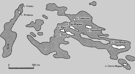 Рис. 7. Карта Азорских островов. Азорское подводное плато заштриховано
