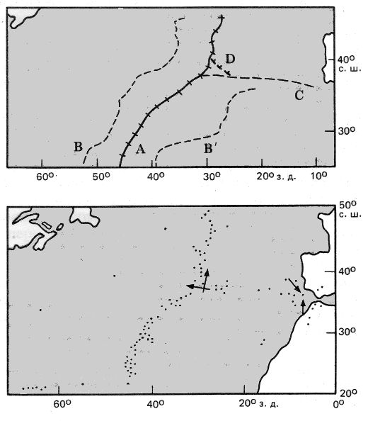 Рис. 8. Вверху: тектоническая схема Азорских островов и окружающего их района. B и B' – границы Срединно-Атлантического хребта. A – Срединно-Атлантический рифт, C – Азорско-Гибралтарский хребет, D – рифт Терсейра. (По А. Нэйрн – Ф. Стегли, 1974). Внизу: карта эпицентров землетрясений в Атлантическом океане. Они расположены вдоль Срединно-Атлантического рифта и Азорско-Гибралтарского хребта. Стрелки показывают напряженность гравитационного поля во время землетрясений на Азорских островах. (По данным тех же авторов)