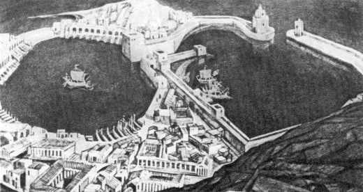 Фото 17. Реконструкция древнегреческой Аполлонии, возведенной на финикийских фундаментах. Город вместе с портом был уничтожен землетрясением и опустился под воду. Аполлония имела две гавани: внешнюю – торговую и внутреннюю – военную. Планировка города во многом напоминает описанную Платоном Атлантиду. (По Р. Дикону, 1969)