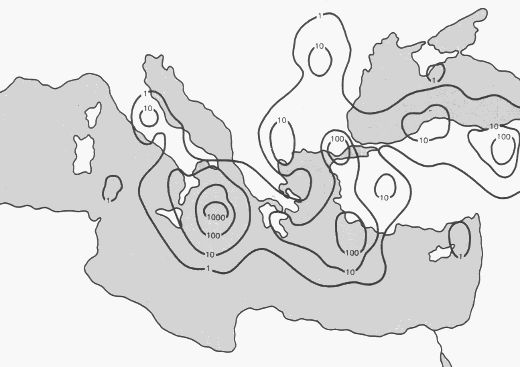 Рис. 24. Карта так называемого «риска землетрясения» в Восточном Средиземноморье. Изолиниями соединены точки с одинаковой энергией землетрясения. Цифры выражают энергию в 1015 эрг • км-2- год-1. (По К. Ломнитцу, 1974)