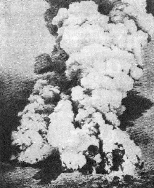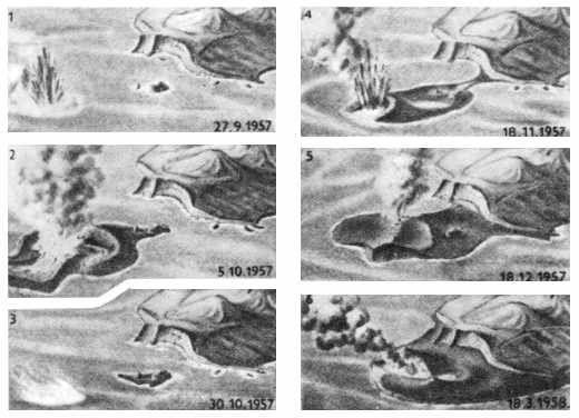 Фото 20. Возникновение вулканического острова Суртсей у берегов Исландии. (По Г. Макдональду, 1972)