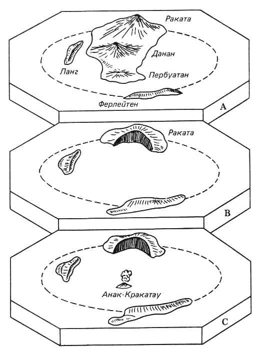 Рис. 28. Образование кальдеры на месте острова Кракатау после гигантского взрыва 1883 года. После обрушения кратеров Данаи и Пербуатан в результате подводной вулканической деятельности над поверхностью моря появился конус нового вулкана, названного Анак-Кракатау. (По Г. Макдональду, 1972)