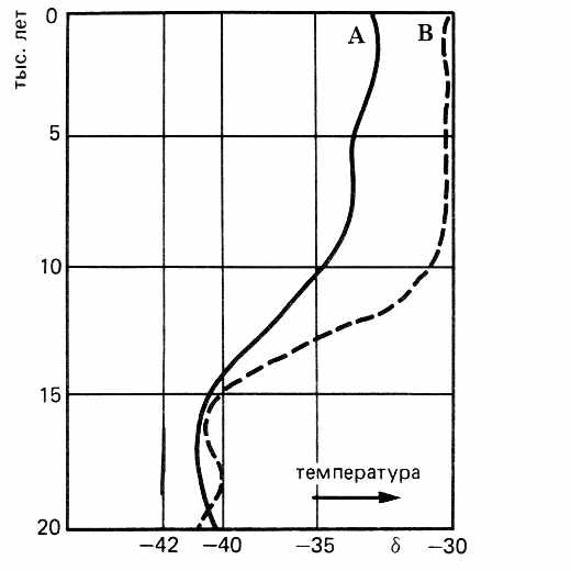 Рис. 33. Сопоставление климатических данных, полученных путем исследования антарктического льда (кривая A) и гренландского льда (кривая B), показывает, что гляциалы и интергляциалы (ледниковые и межледниковые эпохи) были синхронны в обоих полушариях. (По А. Гоу и Т. Вильямсону, 1971)