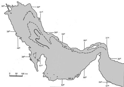 Рис. 40. Морская трансгрессия в Персидском заливе. В плейстоцене залив был сушей, 8000 лет назад береговая линия проходила на месте кривой 1, 16 000 лет назад – на месте кривой 2, 4000 лет назад – на месте кривой 3. (По М. Сарнтейну, 1972)