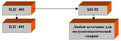 ПДГ-401 подающий механизм полузакрытого типа. Внутри установлен 2-х роликовый редукторный привод CWF 3110, кассета для сварочной проволоки, тормозное устройство, плата управления и электромагнитный клапан. На лицевой панели механизма имеются резисторы регулировки скорости подачи сварочной проволоки и напряжения.