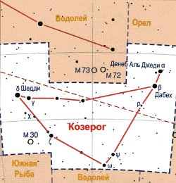 β Козерога — Дабих — двойная звезда, состоящая из двух компонентов 3-й и 6-й зв. величин.