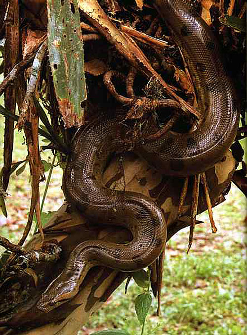 Гигантская анаконда, или большой водный удав, обычно бывает не длиннее 5 метров, но может достигать 11 метров, соперничая в этом с самыми крупными питонами. Желтая анаконда намного меньше. Темно-зеленая с пятнами, гигантская анаконда живет по берегам тропических рек к востоку от Анд и в Тринидаде. Она охотится ночью, подстерегая добычу в воде. Зубами она захватывает жертву и, обвившись вокруг нее, душит, или чаще топит ее в воде. Жертв анаконды выбирают размером с поросенка или каймана. Крупные кайманы, впрочем, и сами не прочь полакомиться мясом анаконды, так же, как и ягуары, часто устраивающие охоту на водных удавов. Нередко раненая в подобных схватках анаконда становится добычей пираний. Но избегнув неприятных встреч, анаконда может дожить до 75 лет.