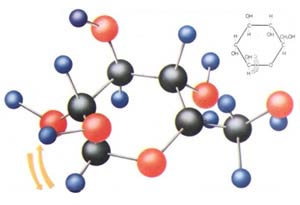Модель молекулы p-D-глюкозы. Черным цветом обозначены атомы углерода, красным – кислорода, синим — водорода. Глюкоза является моносахаридом – простейшей формой сахара. Все сахара – это алифатические органические соединения, называемые углеводами и состоящие только из атомов углерода, кислорода и водорода.