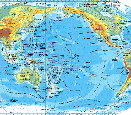 Рельеф дна. Значительная часть лежит на одной литосферной плите. По границам – сейсмические пояса. Шельф невелик, по окраинам – 25 из 35 глубоководных желобов. На юго-востоке – Восточно-Тихоокеанское поднятие, из системы срединно-океанических хребтов.